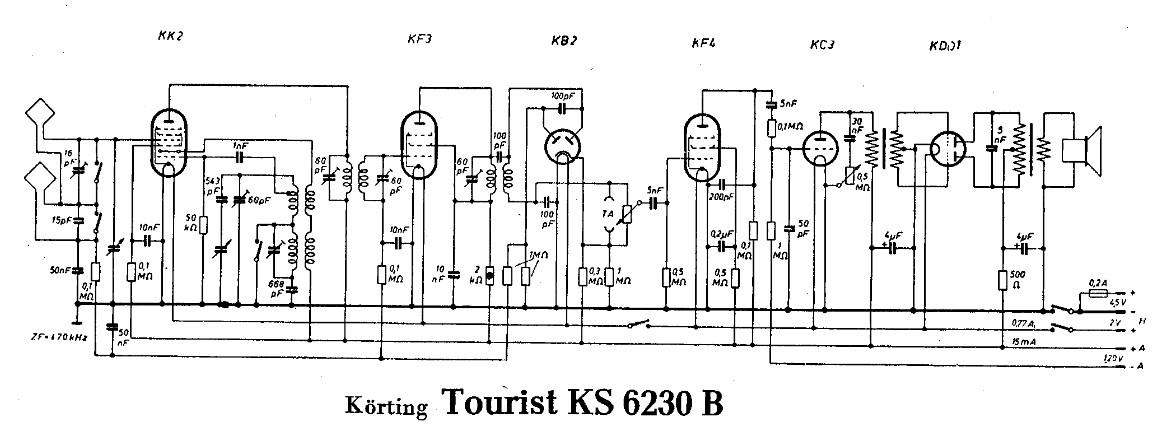 Schaltung: | Superhet | Röhren/Halbl.: | 6 (KK2, KF3, KB2, KF4, KC3, KDD1) | Kreise: | 5 | Frequenzen: | MW, MW | Lautsprecher: | 1 (permanent-dynamisch) | Spannungen: | Batterie 120 Volt / 4,5 Volt (für G1 der KC3). Heizung 2 Volt (Batterie o. Akku (extern zu laden)) | Gehäuse: | Holz bespannt, Lautsprecherabdeckung zweistufig klappbar | Skala: | rechteckig oben on top | Abstimmung: | Drehkondensatoren | Komfort: | 2 Rahmenantennen für LW u. MW, TA-Anschluss, Klangblende, Tragegriff. | Gewicht: | 9 (10) kg | Maße: | 42 x 34 x 19 cm | Bemerkung 1: | Trioden-Gegentakt-Endstufe für 2 Watt in B-Betrieb. ZF 470 kHz, Stromsparschaltung (bei TA werden die KK2, KF3, KB2 nicht geheizt), | Bemerkung 2: | Eigene Regelspannungsdiode für Misch- und 1. ZF-Stufe. 2 NF-Transformatoren. Damaliger Preis 256,50 RM | Bemerkung 3: | Die Fotos wurden von "Reinhard_M", Reinhard u. von "WalterBar" aus dem Wumpus-Gollum-Forum bereit gestellt | Gruppe: | (F) | Details 1: | als PDF-Datei anzeigen ... | Details 1: | anzeigen ... | Details 2: | anzeigen ... |
