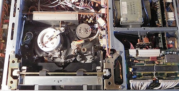 Ein Blick in das Innere des VHS-Video-Recorders Telefunken VRV640. (2) Gut ist der Rotationskörper mit den Bildköpfen und die Cassetten-Führungsmechanik mit dem Band-Einschwenkmotor zu sehen.